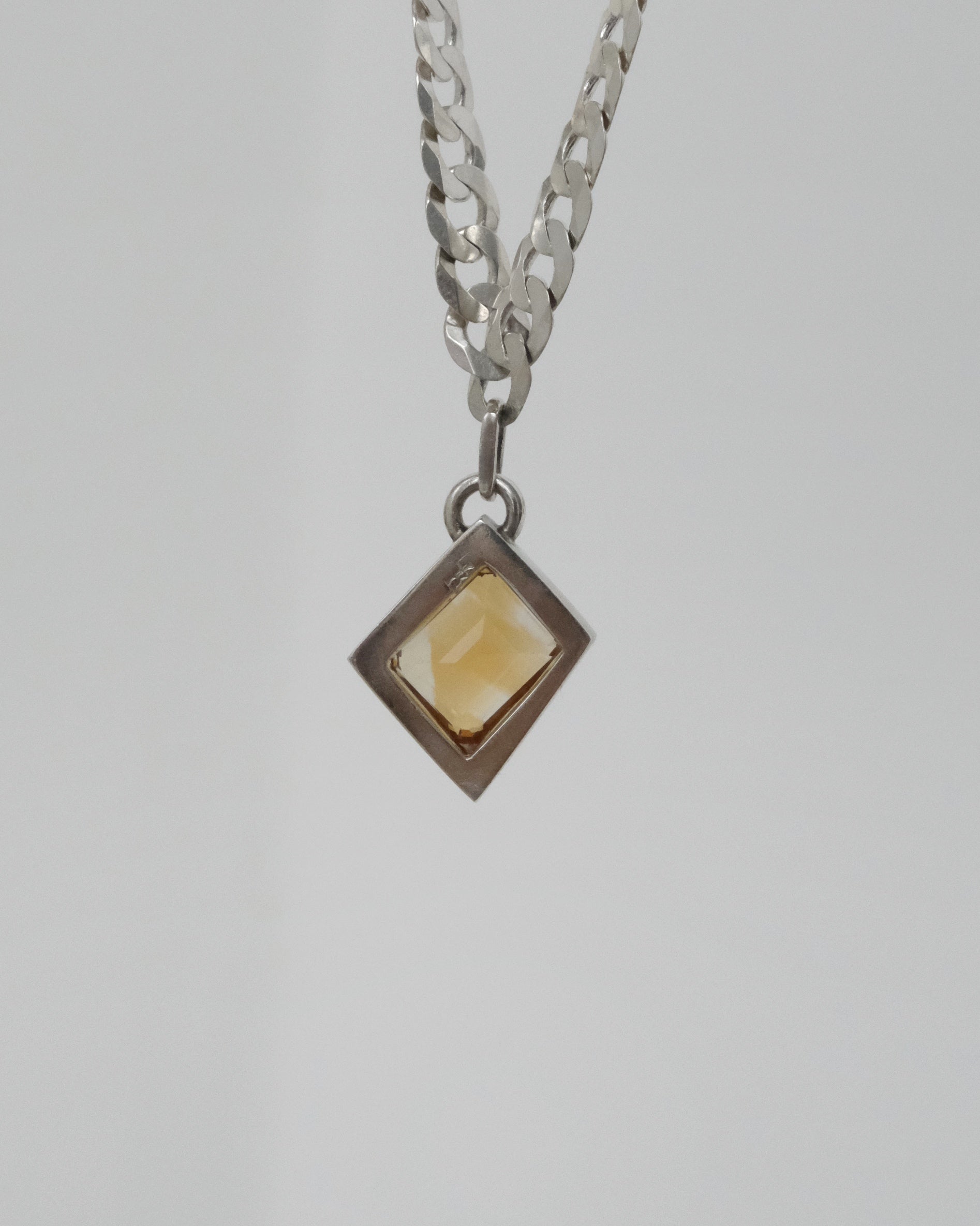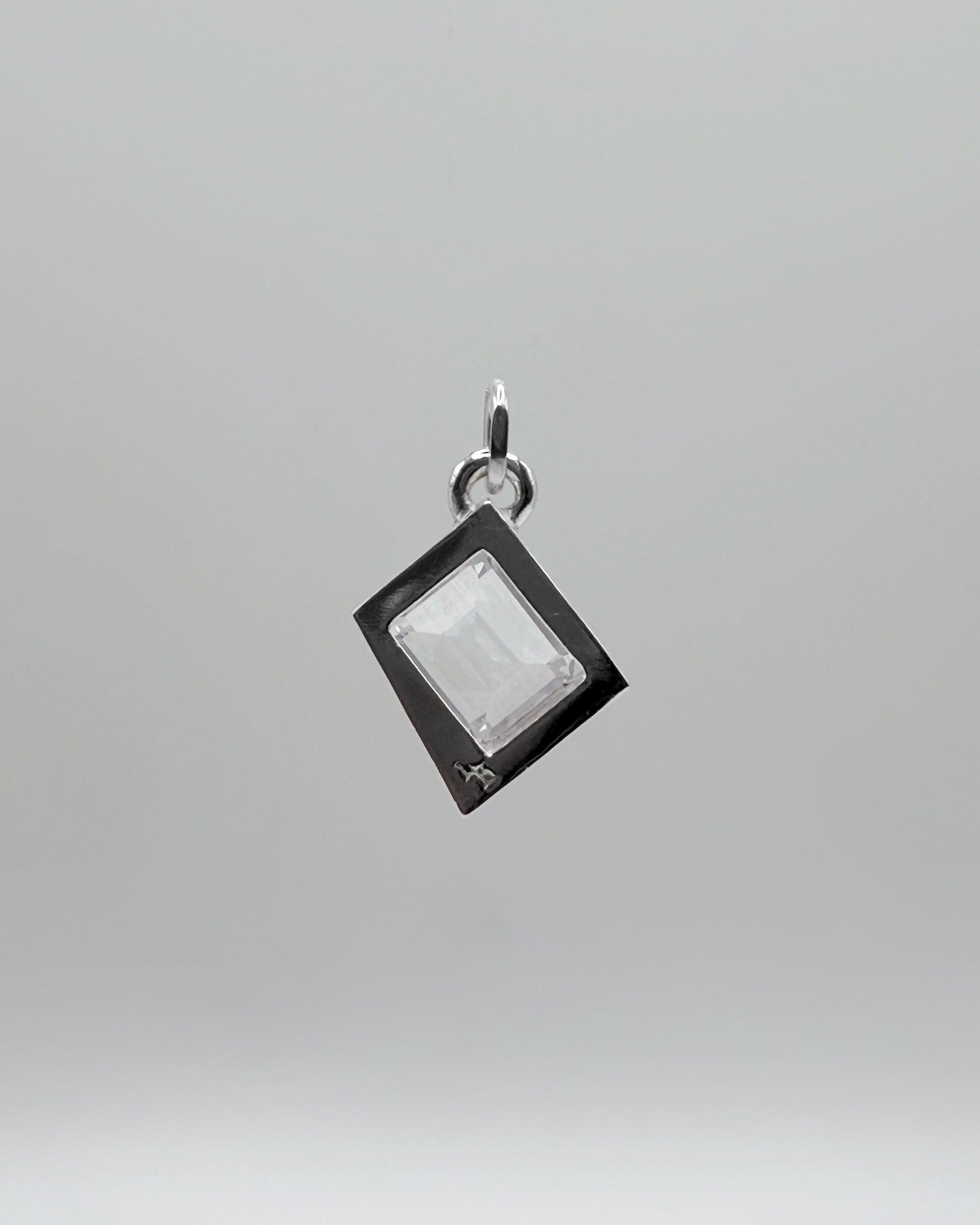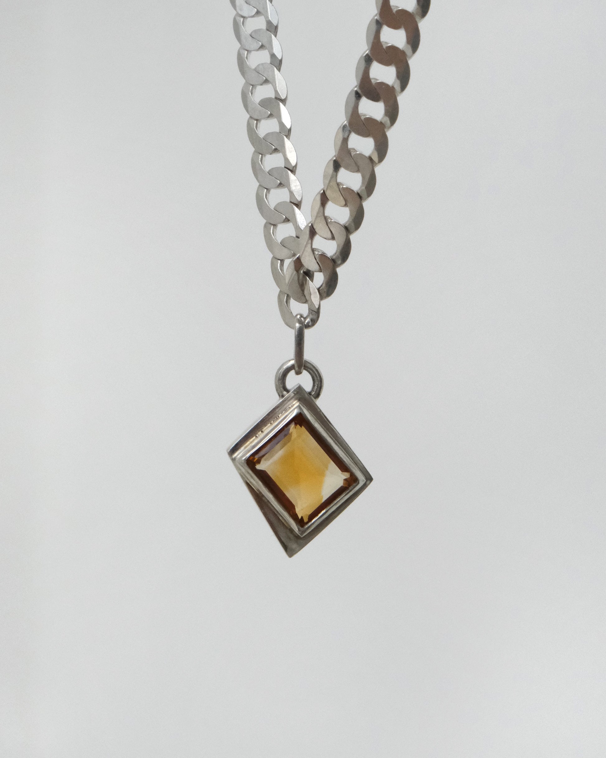 The Night Pendant is a window gemstone pendant. The pendant is a handmade asymmetrical four sided silver frame. Set inside the frame is an emerald cut citrine, amethyst or white cubic zirconia in a bezel setting.