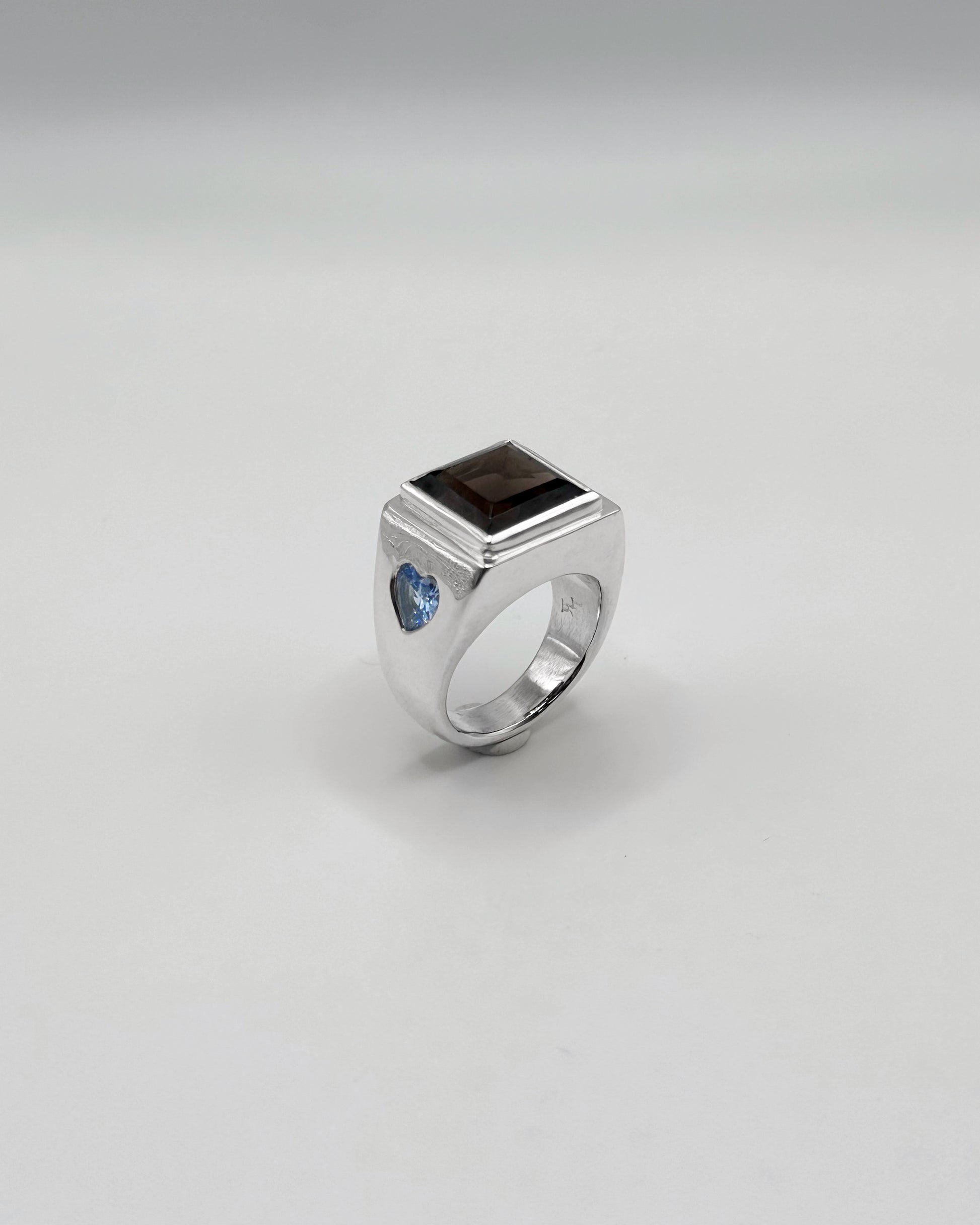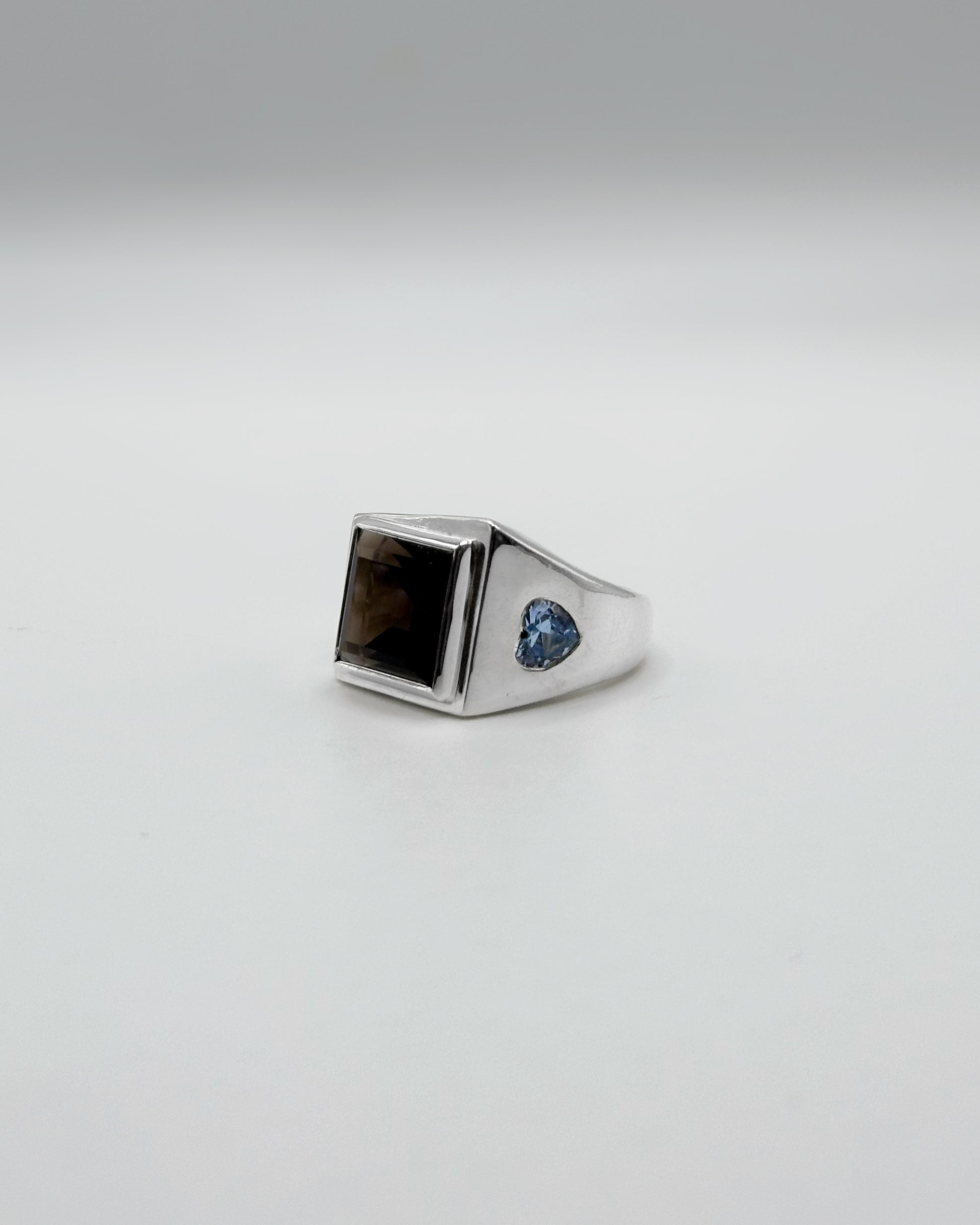 Gemstone: Square smokey quartz, heart-shaped synthetic aqua blue spinel/ synthetic blue sapphire