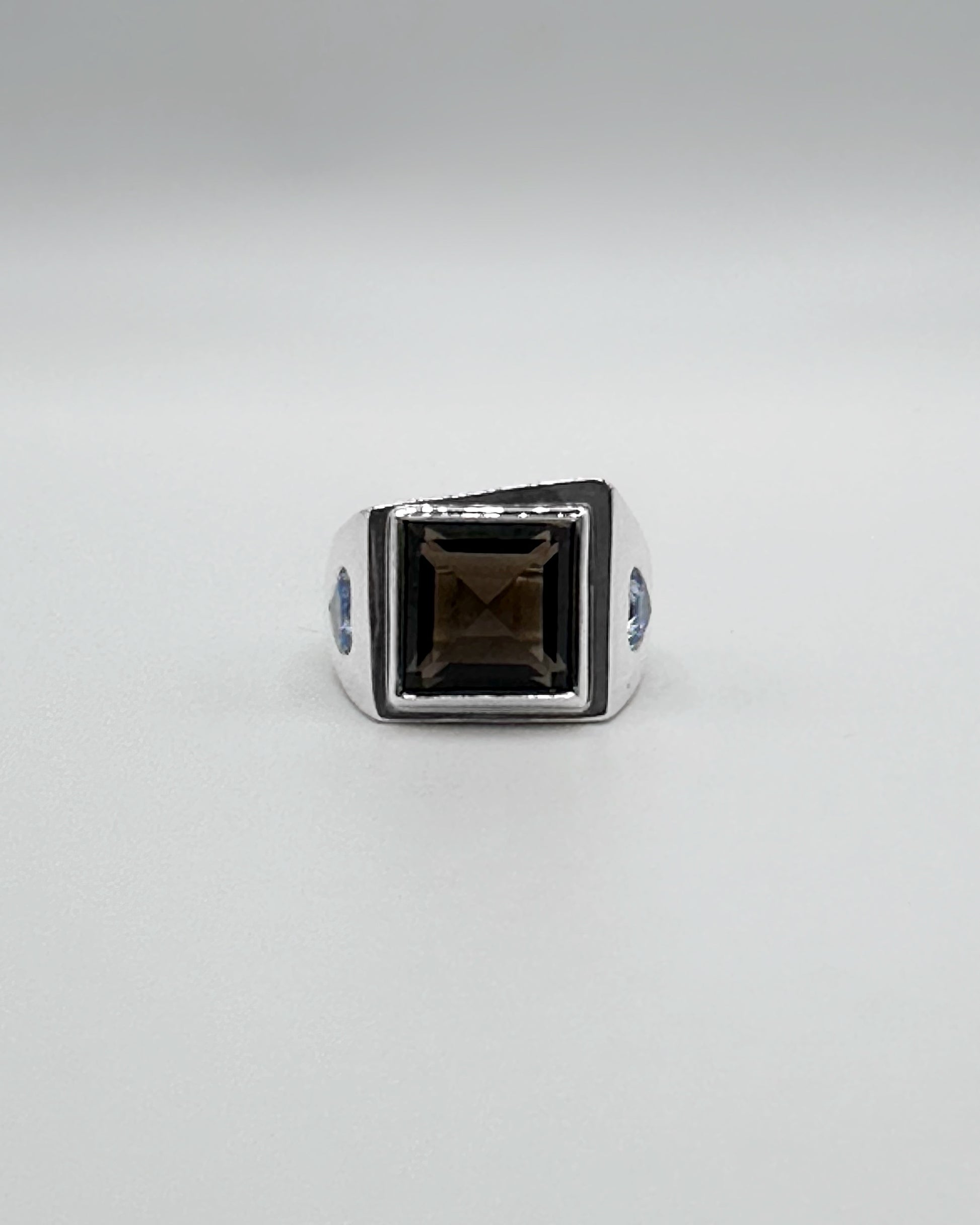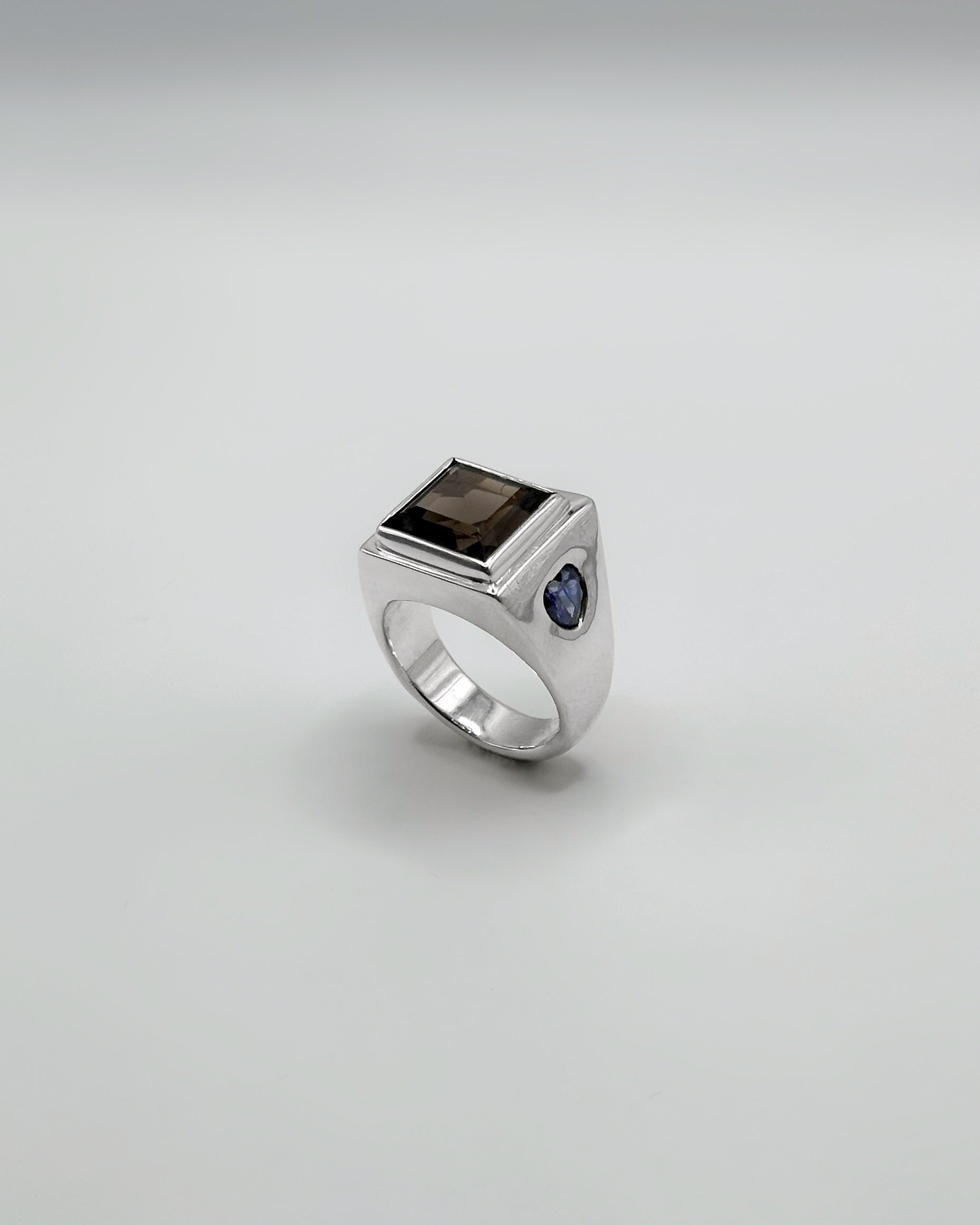 Material: Recycled 925 silver, smokey quartz, synthetic aqua blue spinel/ synthetic blue sapphire